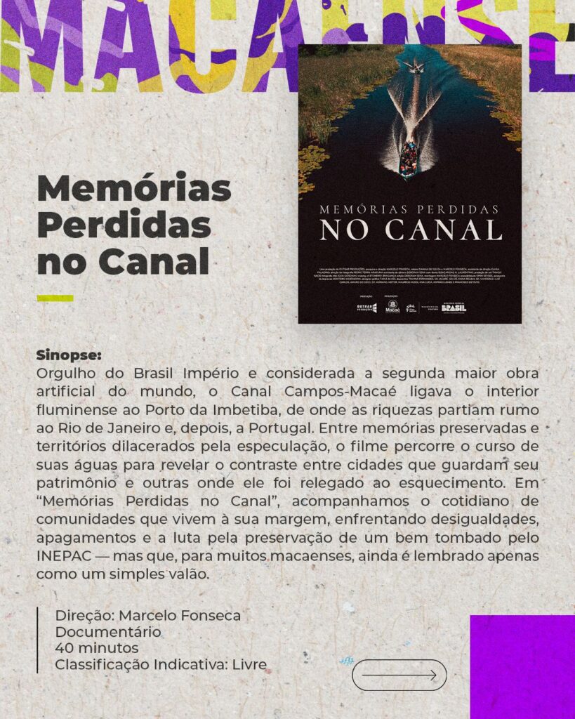 O documentário “Memórias Perdidas no Canal”, dirigido por Marcelo Fonseca, será exibido em diferentes espaços de Macaé nos dias 15, 17 e 21 de outubro, promovendo reflexões sobre a história e a importância do Canal Campos–Macaé, uma das maiores obras de engenharia do Brasil Império e um marco do patrimônio histórico e ambiental fluminense.