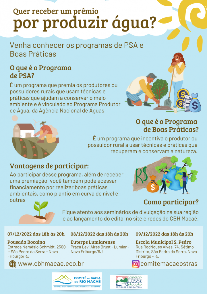 O Programa de Pagamento por Serviços Ambientais (PSA) e Boas Práticas em microbacias hidrográficas do Comitê Macaé Ostras e Boas Práticas busca reconhecer, incentivar e premiar em dinheiro os possuidores de áreas rurais que contribuam com a conservação e preservação ambiental, garantindo água em quantidade e qualidade para toda a sociedade.